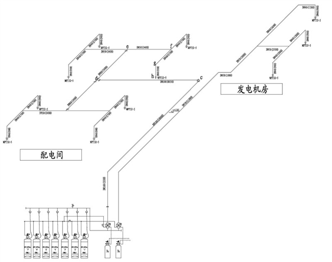 該工程為某商業(yè)大廈地下二層氣體消防工程,首先明確建筑物本身的建筑特點(diǎn)和功能特點(diǎn),了解該建筑地下二層的防火工程設(shè)計(jì)中其它專業(yè)的設(shè)施及對消防專業(yè)的設(shè)計(jì)要求,然后根據(jù)有關(guān)規(guī)范對建筑物定性,確定系統(tǒng)的總體結(jié)構(gòu)。按照氣體滅火設(shè)計(jì)規(guī)范,該樓層配電房、發(fā)電機(jī)房、油庫不能應(yīng)用水噴淋滅火系統(tǒng),因此選用氣體滅火系統(tǒng)方案,以確保消防滅火的可靠性
