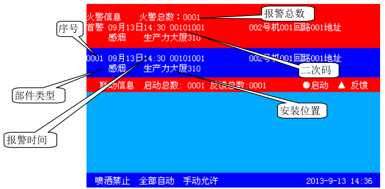 控制器經(jīng)確認(rèn)后進(jìn)入火災(zāi)報(bào)警狀態(tài)并發(fā)出火警聲、光警報(bào)。此時(shí)面板上紅色火警指示燈常亮,液晶屏上顯示火警序號、火警總數(shù)、首警部位、報(bào)警部件的編碼及類型、報(bào)警時(shí)間、安裝位置等信息(詳見圖上半屏顯示),同時(shí)打印機(jī)、歷史記錄記錄相關(guān)火警信息。當(dāng)火警數(shù)量超過兩條顯示時(shí),除首警外,其余報(bào)警可自動(dòng)循環(huán)顯示,按鍵盤上的“▲”、“▼”鍵也可手動(dòng)查詢。
