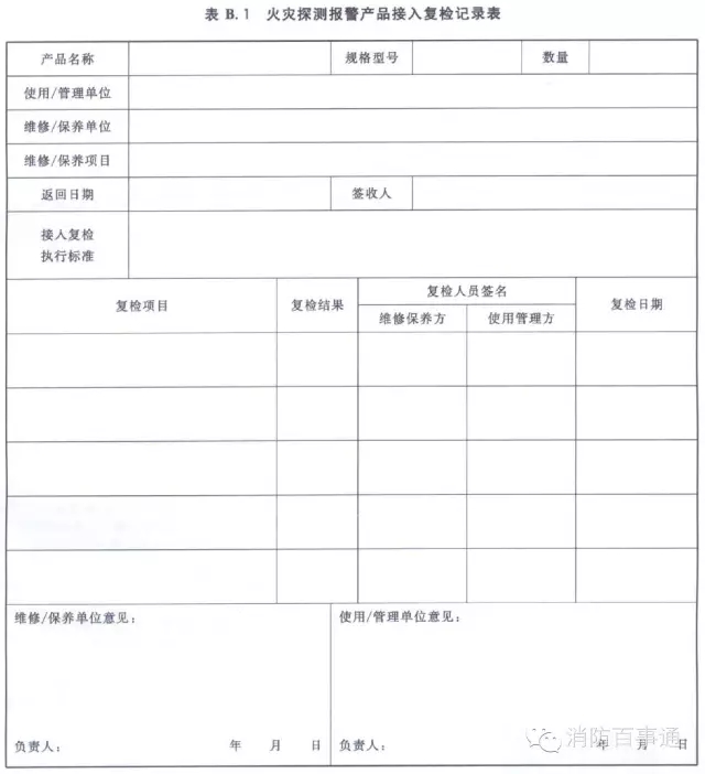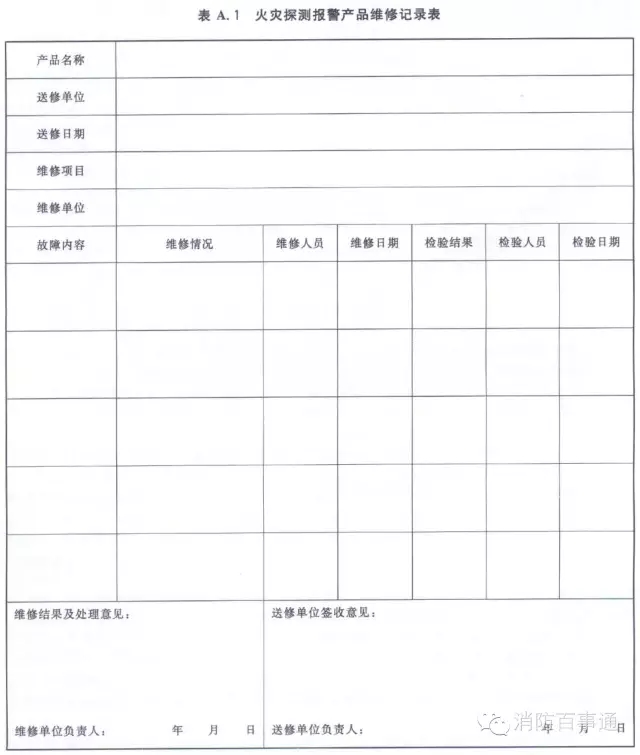 3.1.6承擔維修的企業(yè)應做好維修記錄,與產品使用或管理單位各執(zhí)一份,并保存至該產品報廢?;馂奶綔y報警產品維修記錄表的格式參見附錄A。