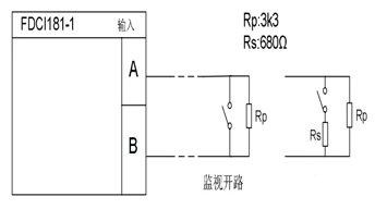 如上圖,AB端引出的兩根線接在被監(jiān)控設(shè)備的干節(jié)點(diǎn)觸點(diǎn)兩端(常開或常閉),電阻Rp接在被監(jiān)控設(shè)備端。顧名思義,監(jiān)控開路就是指當(dāng)A、B兩根線任何一根與被監(jiān)控設(shè)備的連接中斷就會(huì)報(bào)開路故障。這也是為什么Rp接在被監(jiān)控設(shè)備端的目的。如果接在輸入模塊端,那么即使連線出現(xiàn)中斷,也不報(bào)故障,這樣正常的輸入信號就無法傳遞給輸入模塊,消防主機(jī)也無法報(bào)出事件。